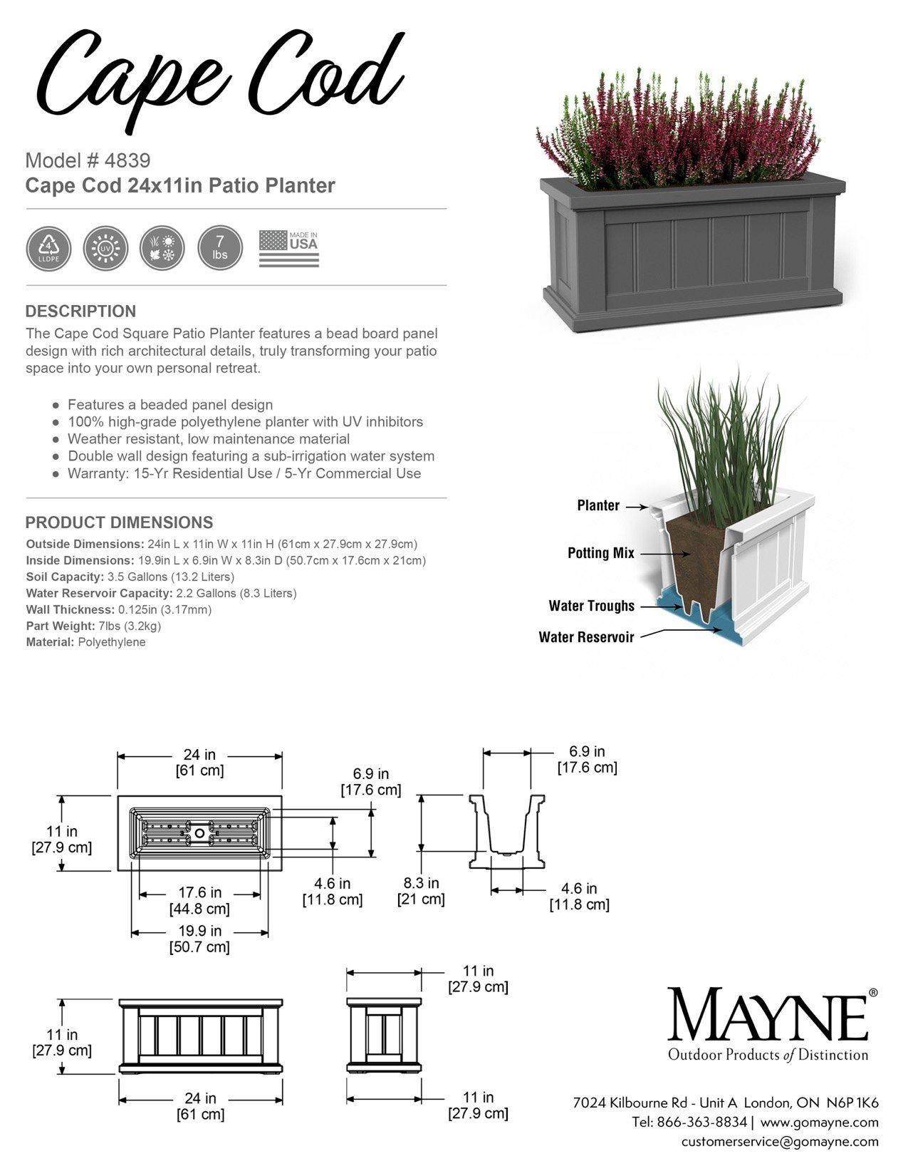 Cape Cod 24 x 11 Rectangle Planter - Instructions & DimensionsUpdated a month ago4839_Cape Cod_Planter_SpecSheet.pdf1023.9KB4839_Cape Cod_Planter_Instruction.pdf1.3MB Was this article helpful? YesNo