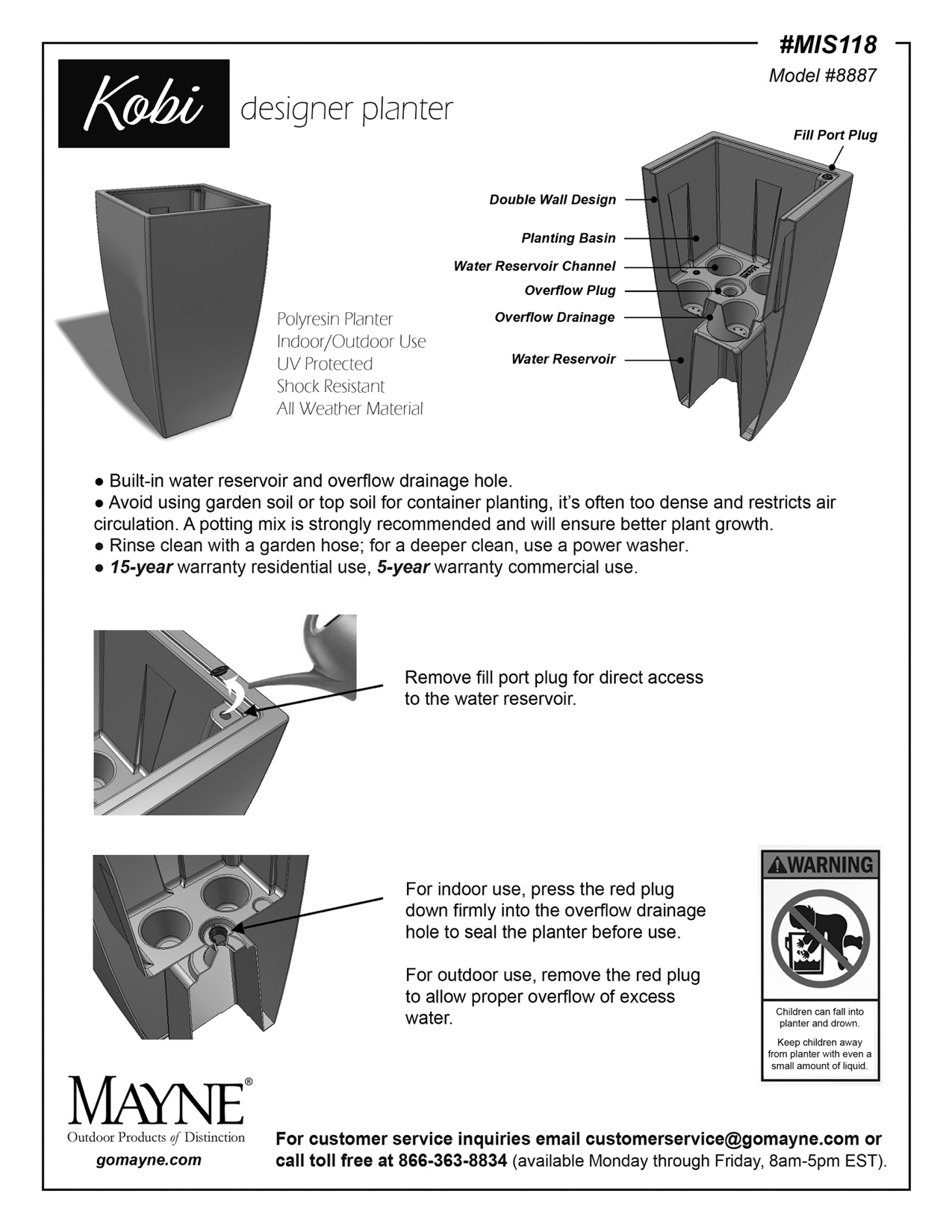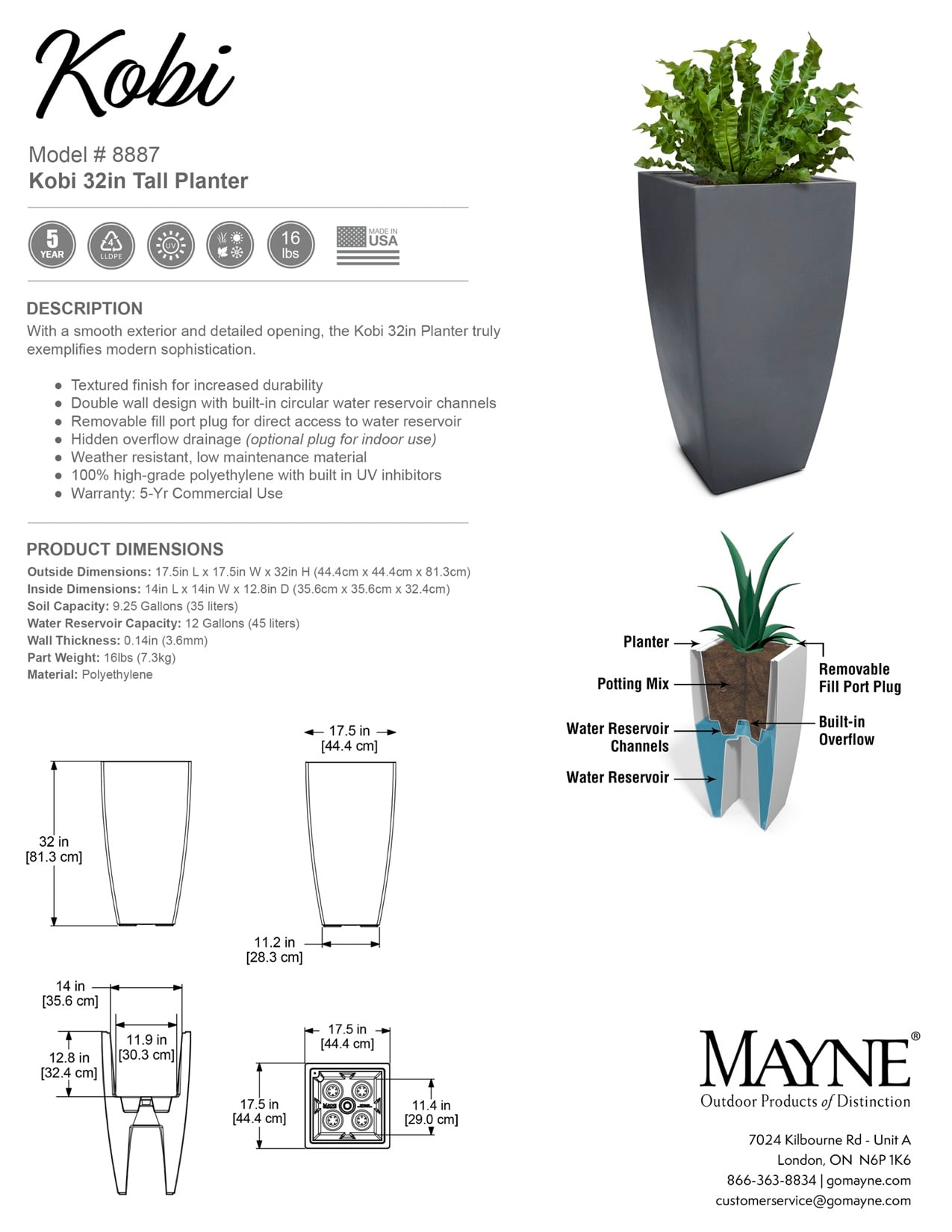 Kobi 32in Tall Planter - Instructions & DimensionsUpdated 10 days ago8887-B_Kobi_Planter_SpecSheet.pdf907.5KB8887-B_Kobi_Planter_Instruction.pdf717.9KBSKU: 8887 Was this article helpful? YesNo