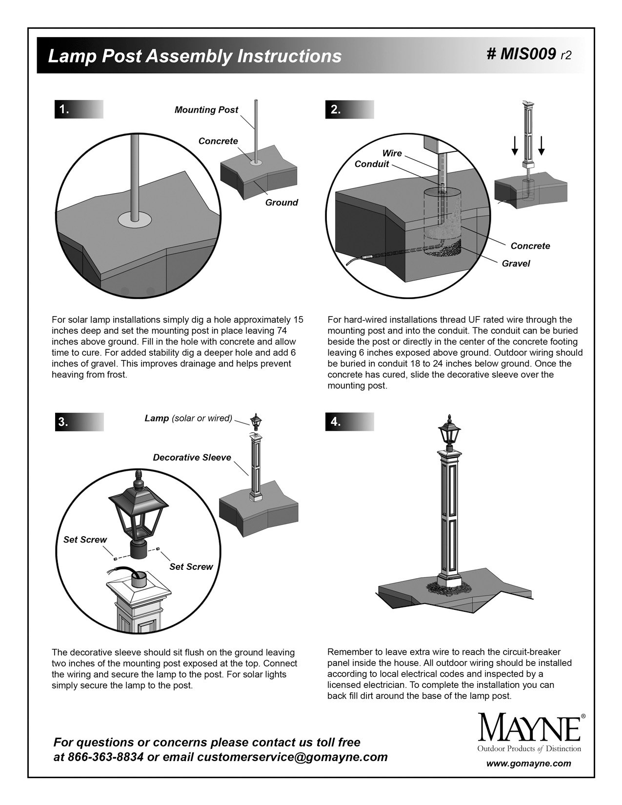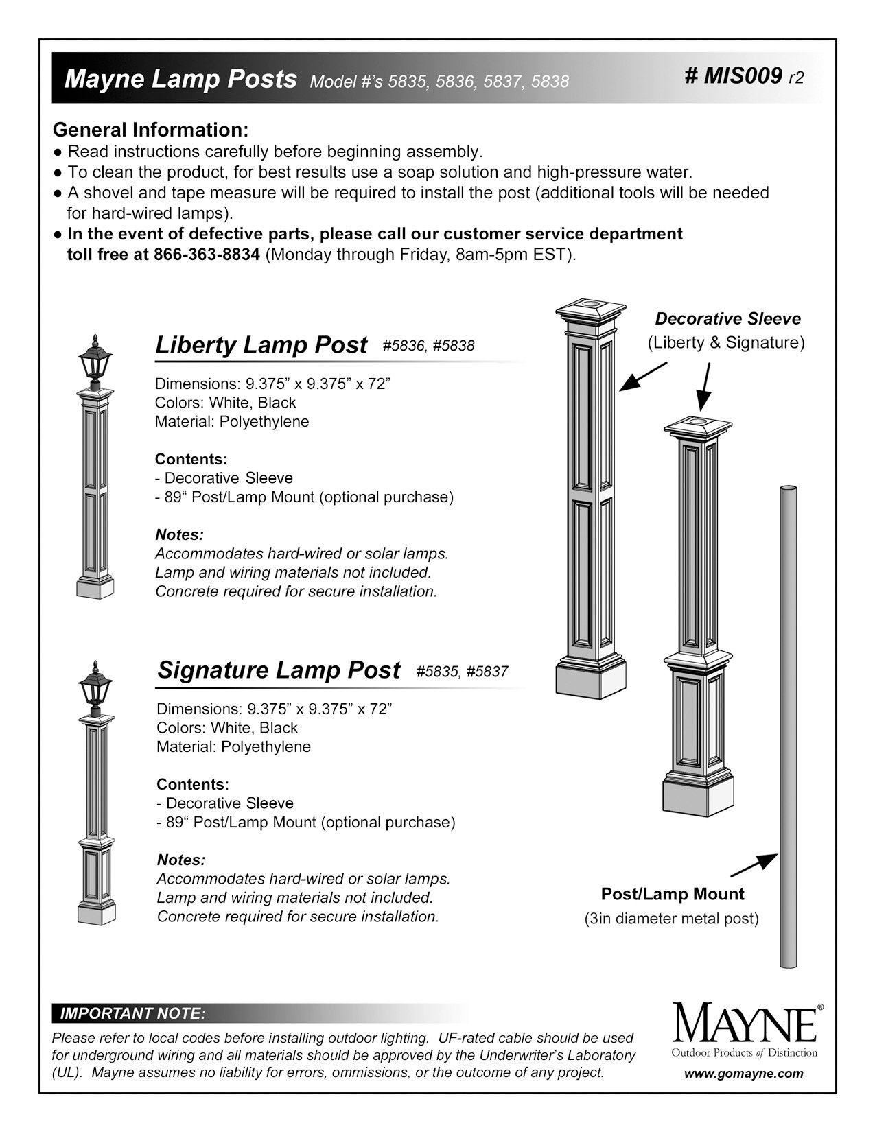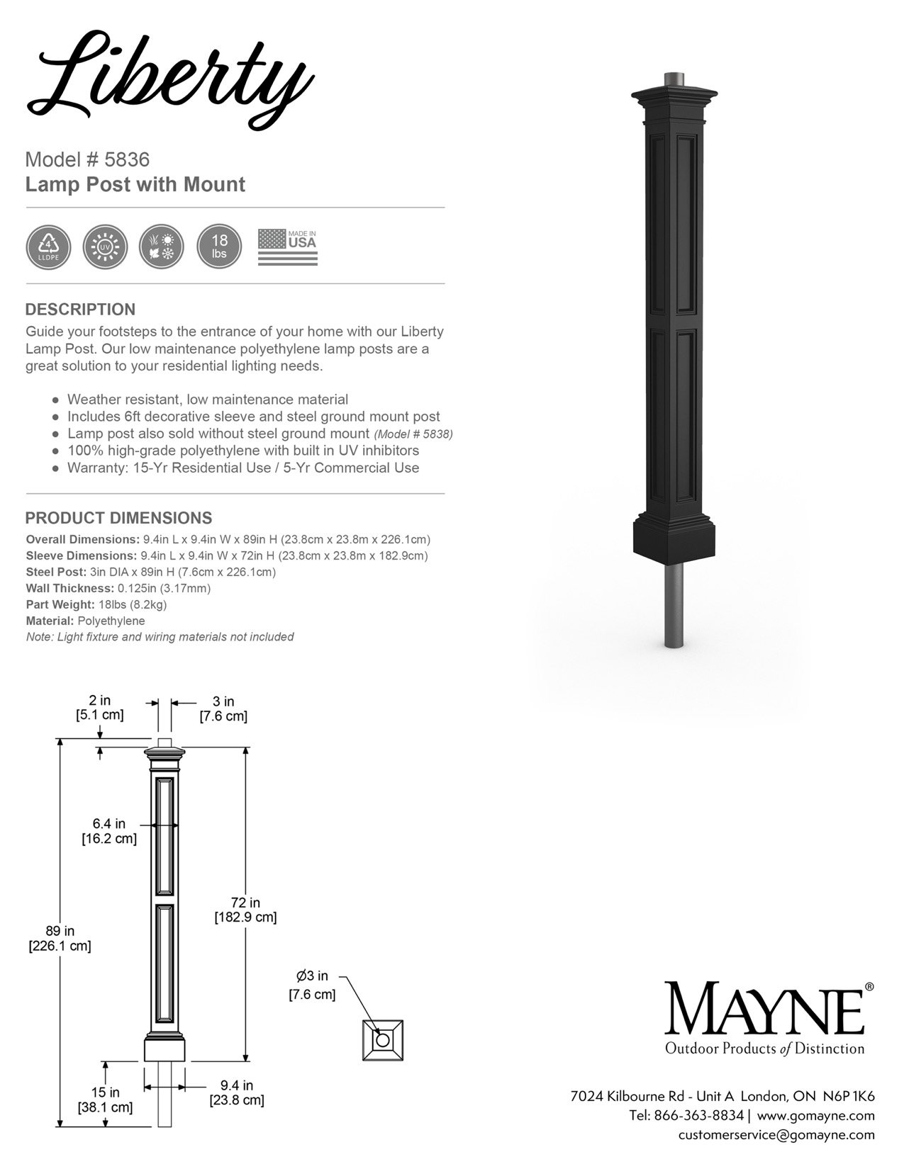Liberty Lamp Post with Mount - Instructions & DimensionsUpdated a month ago MIS009-r3-Lamp Posts.pdf1MB5836-Liberty Lamp Post with Mount-Line Drawing.pdf565.9KB Was this article helpful? YesNo