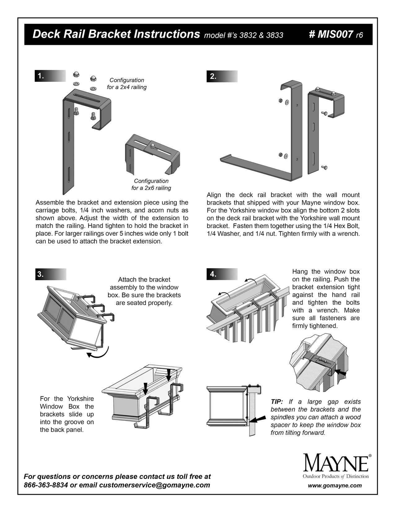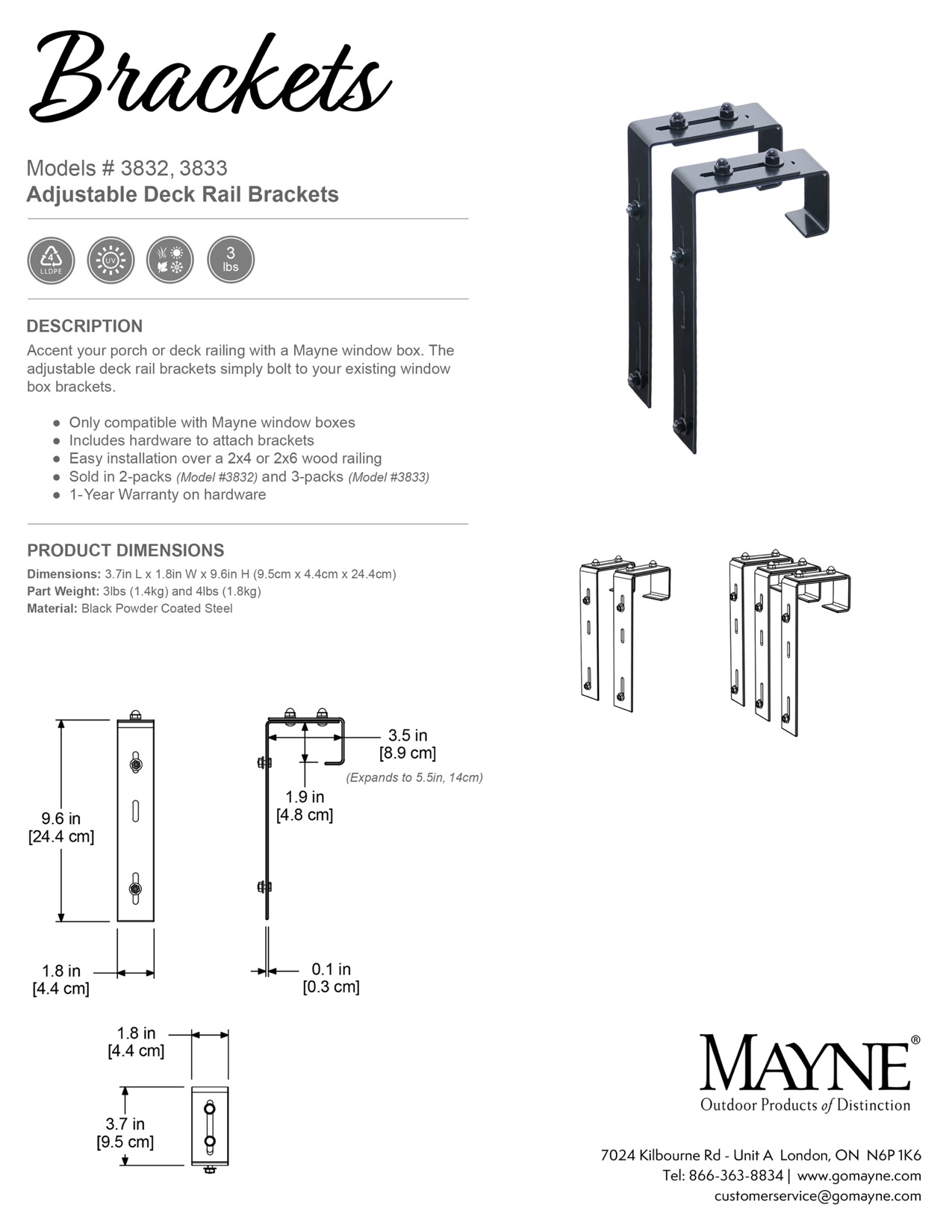 Mayne Adjustable Deck Rail Bracket - Instructions & DimensionsUpdated 10 days ago3832_DeckRail_Bracket_SpecSheet.pdf606.8KB3832_DeckRail_Bracket_Instruction.pdf1.3MBSKU: 3832, 3833 Was this article helpful? YesNo